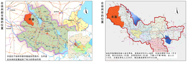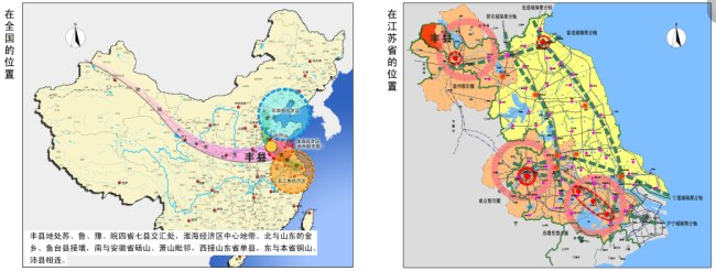 丰县位于江苏省西北部,苏、鲁、豫、皖四省七县交界处,淮海经济区中心地带。丰县历史悠久、人文昌盛,两汉文明一脉相承,源远流长,是汉高祖刘邦的诞育之地,素有“千古龙飞地,一代帝王乡”之美誉。丰县交通区位优势明显,徐菏铁路穿境而过,东临京沪、南至陇海、西靠京九、北倚新石;徐济高速公路、三条省级公路(S321、S322、S254)穿境而过,与京沪、京福、连霍、日东等高速并网;丰县距徐州观音机场100公里,行车时间仅需1小时。已经形成以高等级公路和铁路为骨架,水陆空并举,内联外延,四通八达的交通网络。